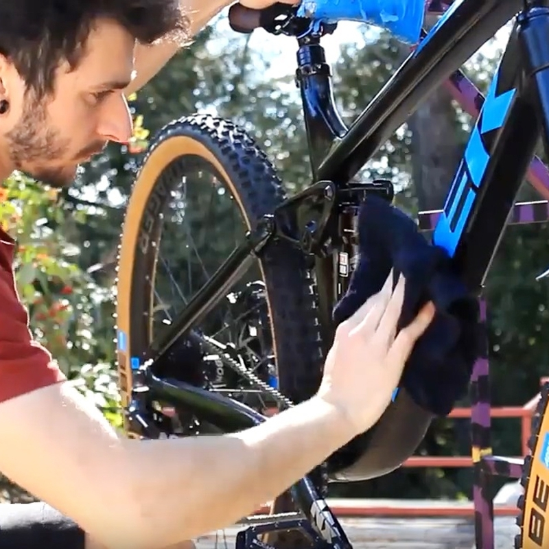 Lors de la vaporisation de la mousse, pensez à vous protéger avec une tablier d’atelier ainsi que des gants en latex pour maintenance du vélo.