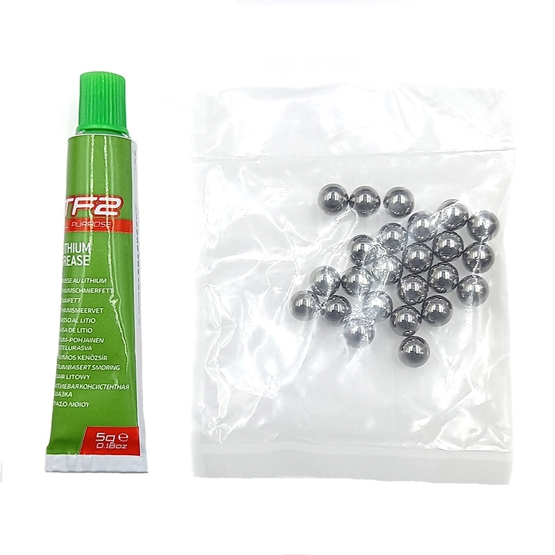 Ce kit constitué de 24 billes en acier cémenté avec tube de graisse lithium haut rendement de la marque Weldtite permet d’entretenir les pièces en rotation présentent sur le boitier de pédalier ou le moyeu de la roue arrière. En complément, nous vous recommandons le kit pour axe de pédalier carré avec cuvettes et roulement à billes.
